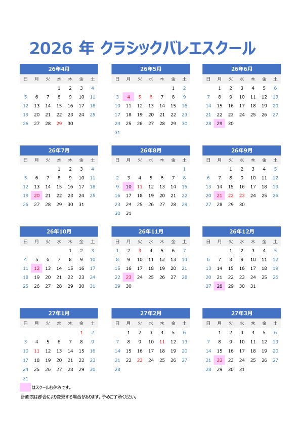 長野市 MAXスポーツクラブ|バレエスクール 年間計画表